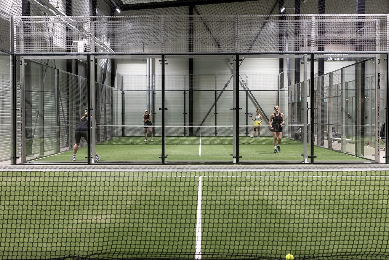ligger denna moderna padelhall med högt i tak och riktigt bra belysning.